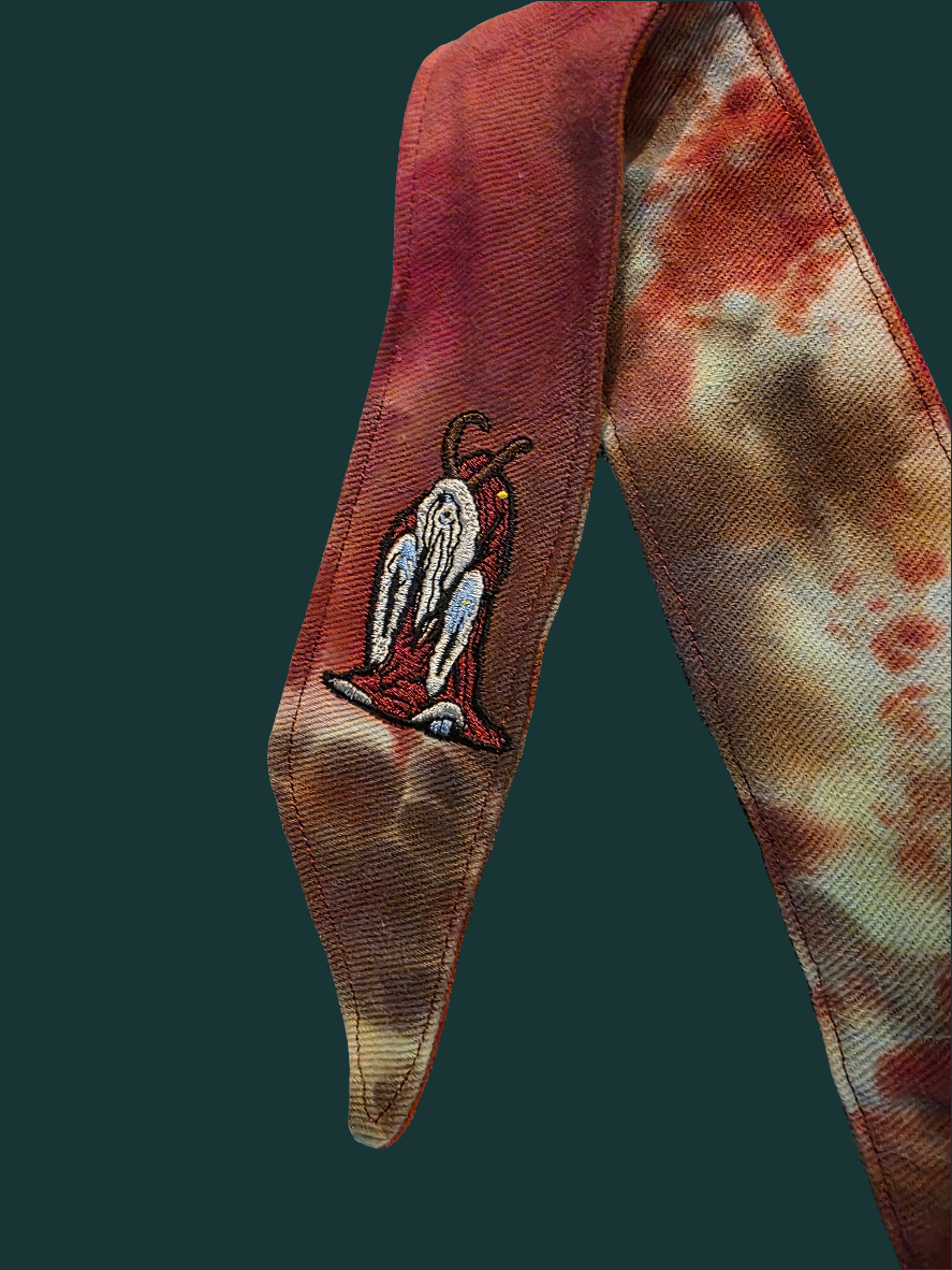This one’s for the bold, the chaotic good, and the Sackletes with a bit of mischief in their DNA. The out-of-print Krampus headband from FrostFire is a fierce blend of holiday horror and battlefield heat. Dyed in deep ember reds and icy forest greens, this piece screams "naughty list enforcer."